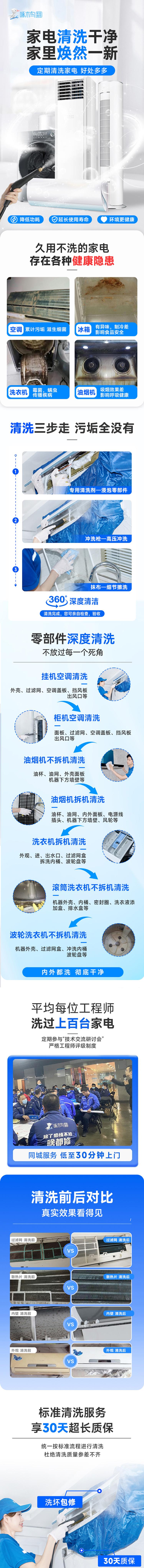 【服务流程】 1、咨询下单 2、确认上门时间 3、上门服务 4、开机试机 5、环境防护 6、拆机清洗 7、高温消毒 8、装机验收 9、售后回访 【保修标准】 1、清洗引起的故障保修30天; 2、免责条款:非清洗引起的故障、动物破坏、电源问题、进液、人为因素、私自拆机、外观件、玻璃件以及其他不可抗因素等不在保修范围。
